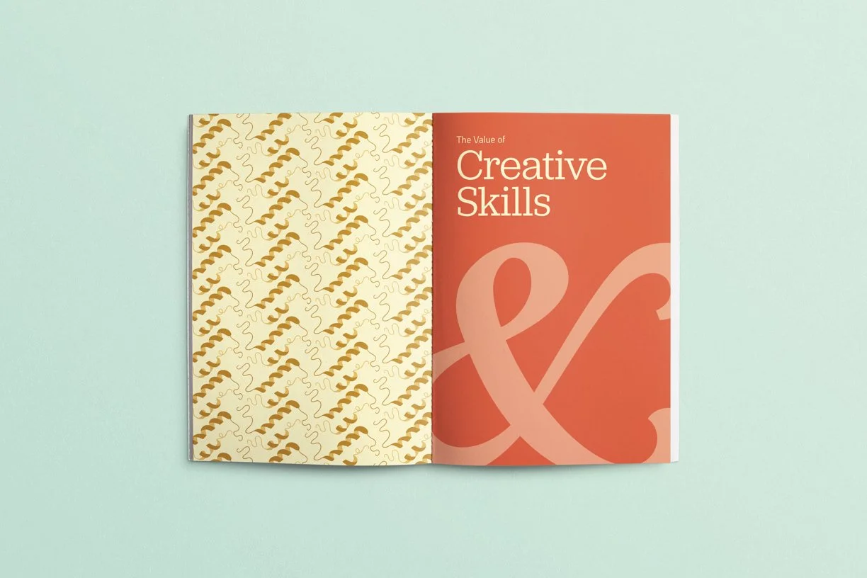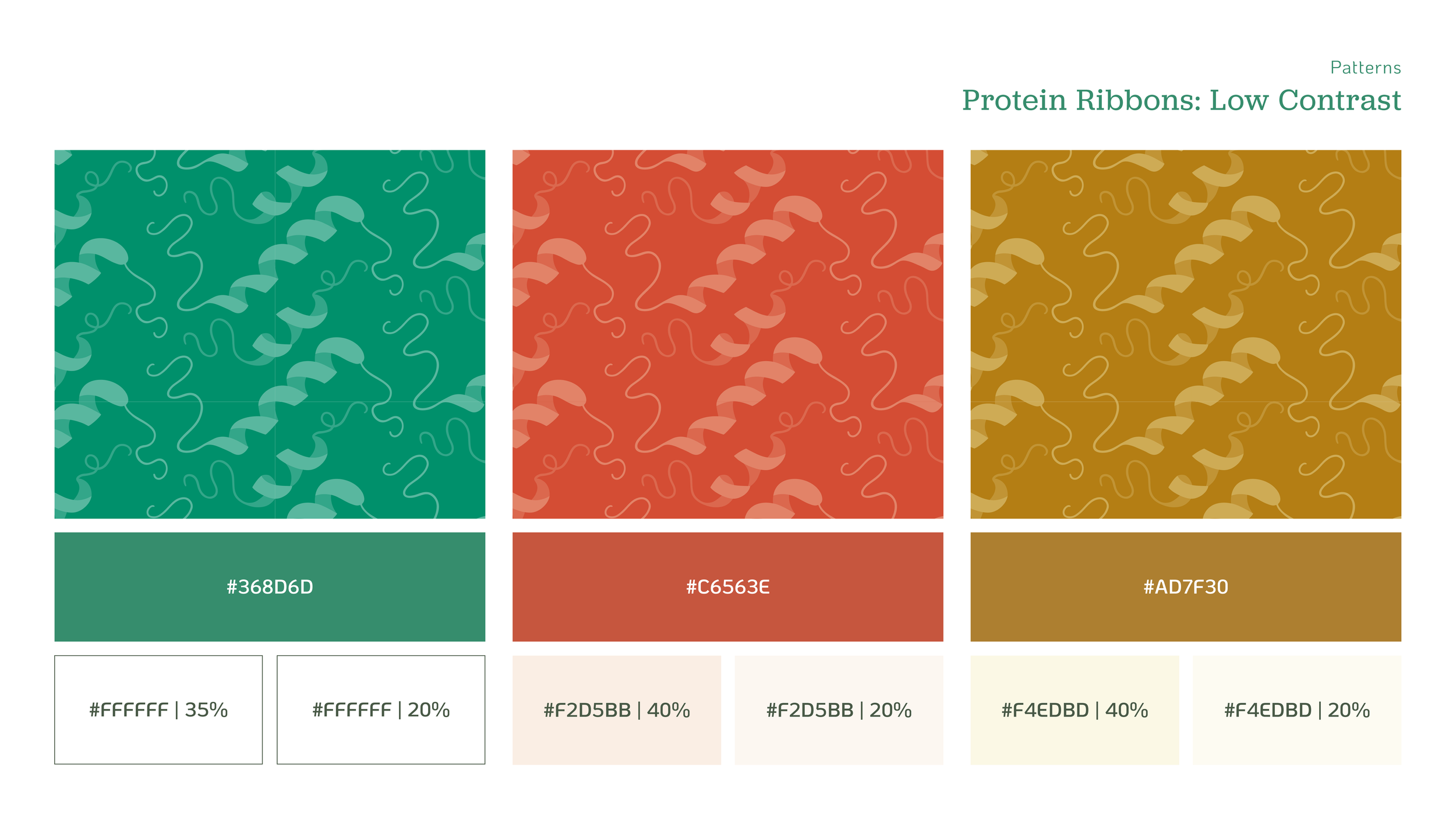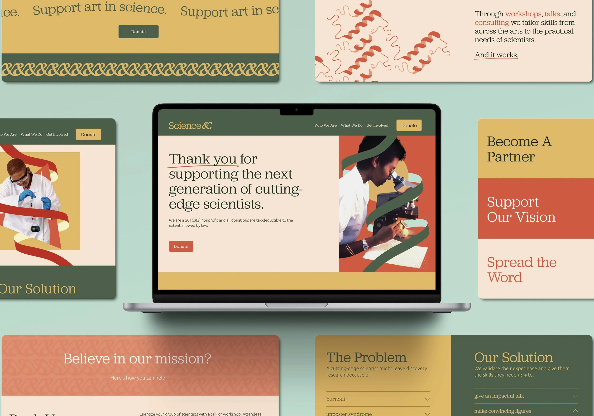 One of my major contributions to Science&’s branding was a library of patterns inspired by both imagery and typography related to the nonprofit’s core values. Ribbon-like illustrations inspired by protein diagrams highight the overlap between art and science, while patterns based on the ampersand and letters from the brand name represent concepts like duality, creativity, and innovation.