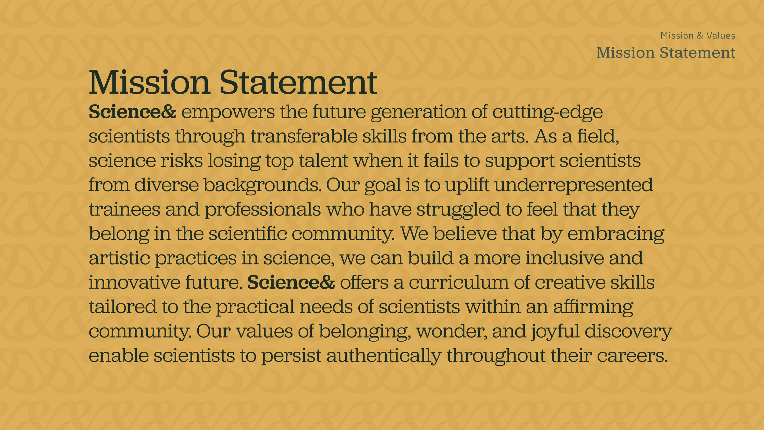 As we narrowed down the mission and purpose of the organization, we focused on the concepts, emotions and visuals that represented our audience in moments when they were thriving. To create a truly inclusive community and inspire the future generation of scientists, we wanted to emphasize the duality that exists in our practice. We see scientists as artisans, and know the value of having diverse teams with varied perspectives. We landed on the ampersand as a symbol for the inclusive nature of our approach and the intersection of art & science.